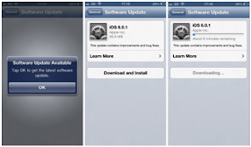Apple ha lanzado, casi por sorpresa la actualización iOS 6.0.1, para la última versión de su sistema operativo. Si desea actualizar su dispositivo iPhone, iPad o iPod Touch, basta con conectar el dispositivo a iTunes y comprobar actualizaciones, o también chequeando las actualizaciones en el propio dispositivo, en “Ajustes>General>Actualización Software”, teniendo en cuenta que hace falta estar conectado a una red Wi-Fi, ya que la descarga ocupa 47,6 MB. A continuación se presentan las capturas de pantalla de la actualización en un iPhone: